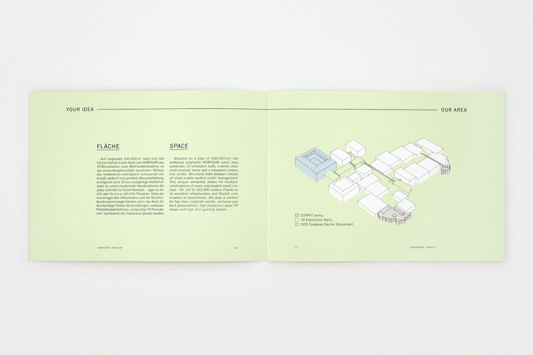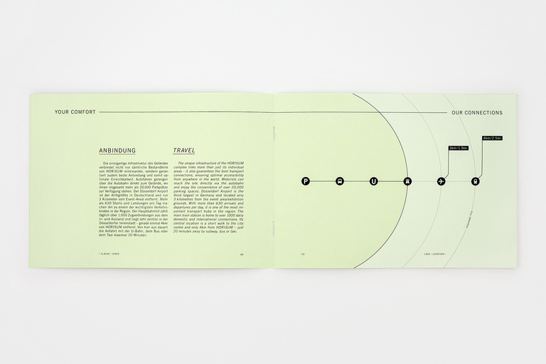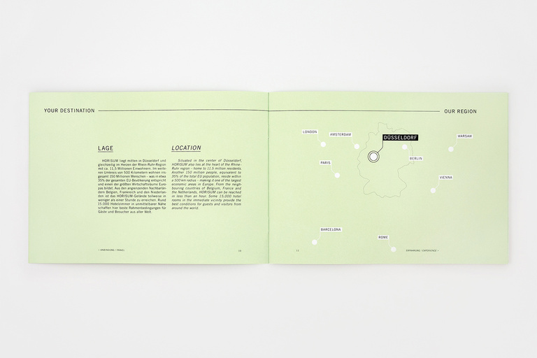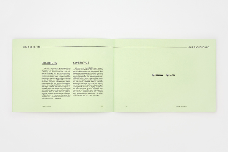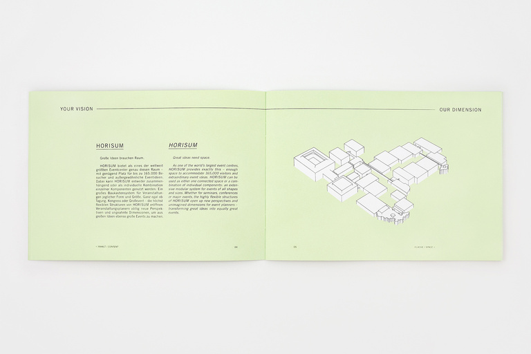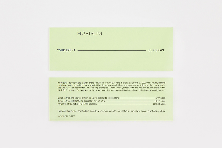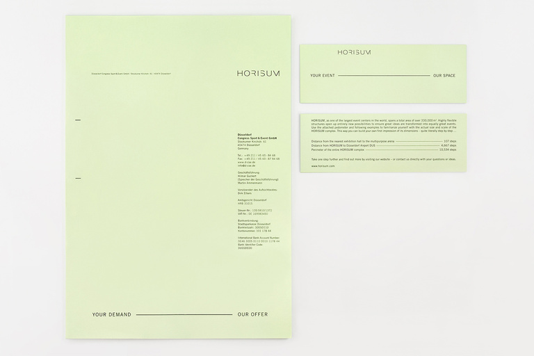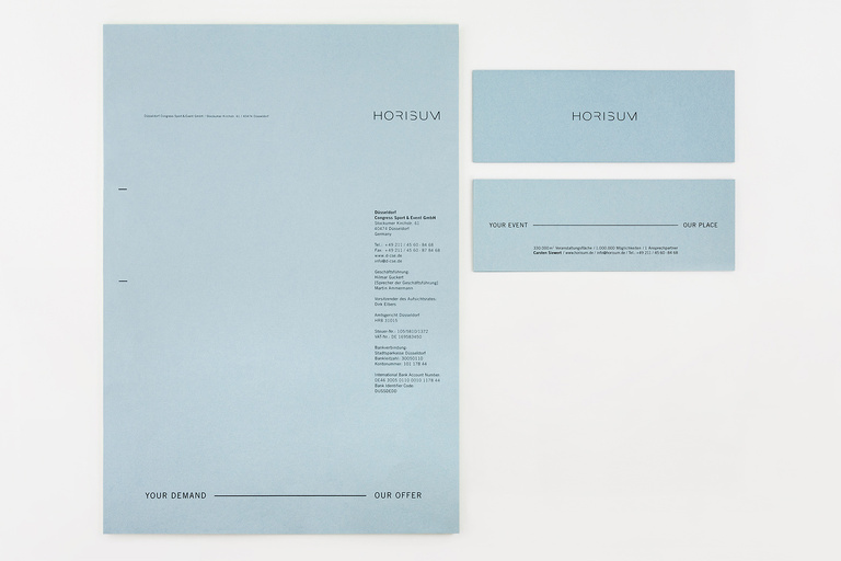 Corporate identity for HORISUM – one of the largest event centers in the world. Based on the name and existing logo, Düsseldorf Congress Sport & Event asked us to develop a new, fresh and unique identity – including everything from a basic colour code to a constant graphic style, a textual tonality, a complex web appearance, the whole stationery, several print-ads, a complete corporate guidance and even a 53-second corporate film.