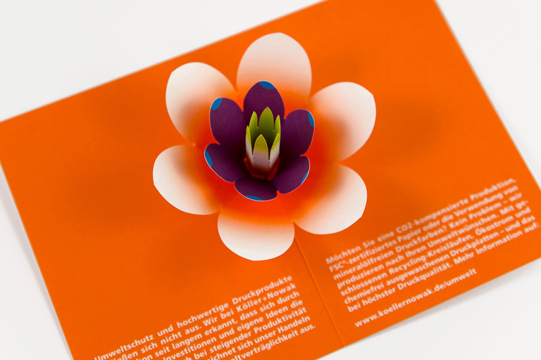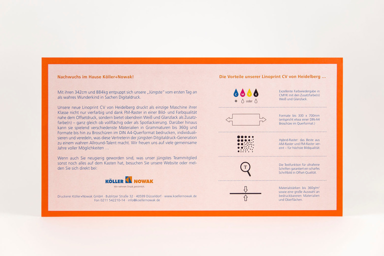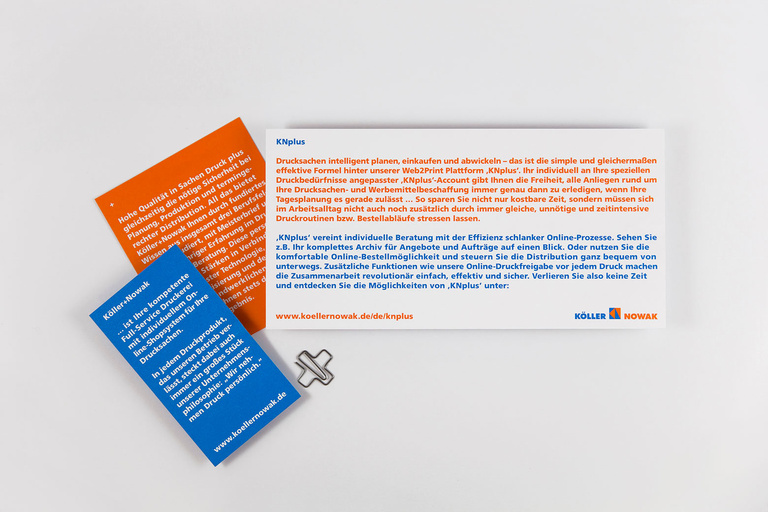 Idea, design and text for several mailings – each focussing on one specific theme such as ‚KN plus’ (K+N’s online service to easily manage all your print jobs at a glance), a bloomy hint to Köller+Nowak’s sustainable production setup or a funny welcome card to introduce the new family member (a 3.5m long and 884kg heavy digital printing machine) to all clients and partners.