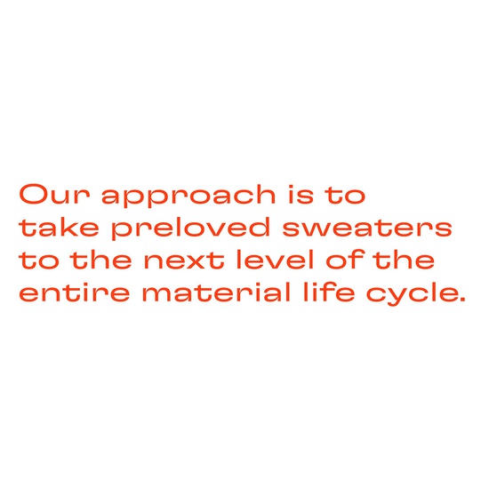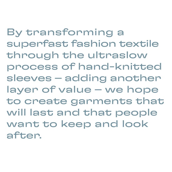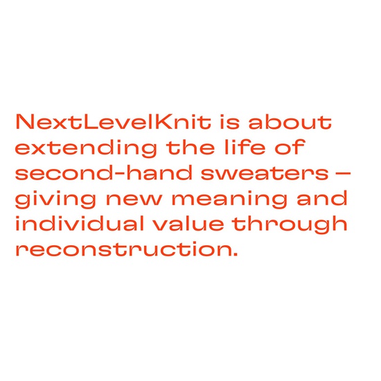 NextLevelKnit is about turning second-hand sweaters into something nearly new. By transforming a superfast fashion textile through the ultraslow process of hand-knitted sleeves – adding another layer of value – NLK hopes to create garments that will last and that people want to keep and look after.
